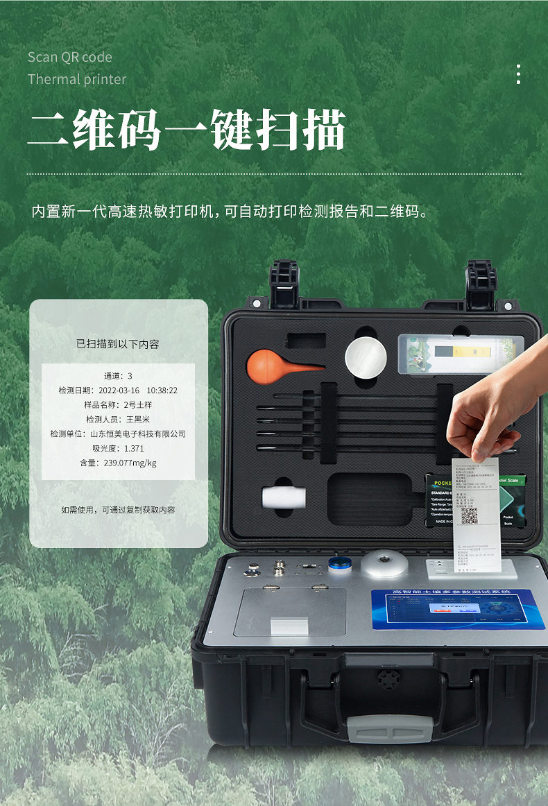 ★18、內置新一代高速熱敏打印機(無需色帶),打印內容包含:檢測單位、檢測人員、檢測項目、通道號、吸光度、養分含量(mg/kg)、檢測時間、以及二維碼等信息