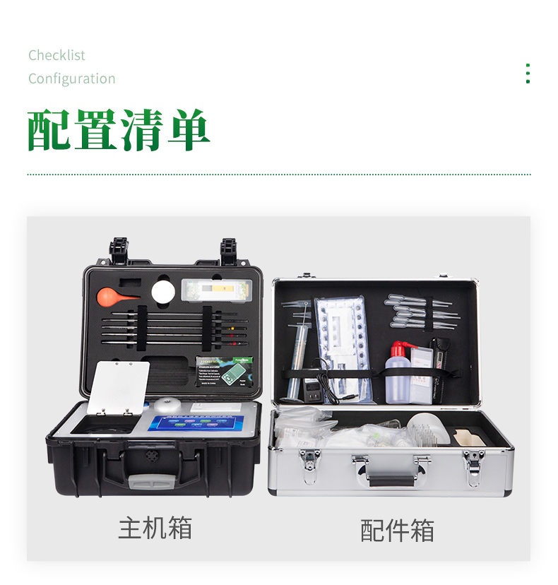 配套齊全:該儀器集藥、器、儀為一體,攜帶方便,相當于一個小型移動實驗室,無需用戶自配附件,亦可靈活野外流動測試。適于農業服務部門或農資經銷商、高教院校、科研院所、合作社、肥料廠商、大種植戶測土施肥和鑒別肥料真假及環保檢測應用。